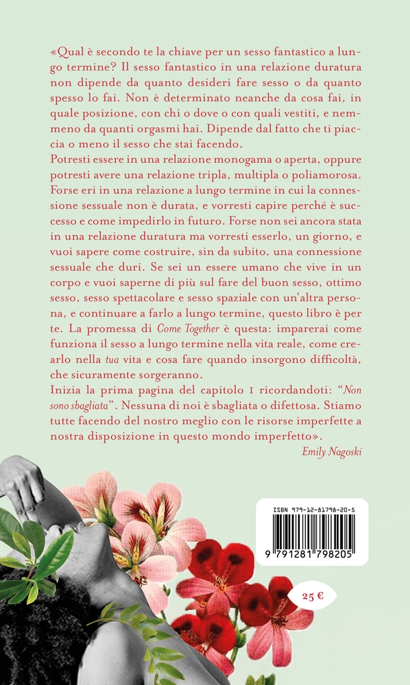 Cosa succede al desiderio quando l’infatuazione iniziale svanisce? Come si coltiva l’intimità sessuale in una relazione che dura nel tempo? In Come Together, Emily Nagoski ci guida con empatia e ironia attraverso la scienza (e l’arte!) della connessione sessuale duratura: con un approccio rivoluzionario, che fonde neuroscienze, psicologia e comprensione umana, smonta i miti sulla sessualità nelle relazioni a lungo termine – come l’idea che il desiderio spontaneo sia l’unico “vero” desiderio – e ci mostra che il vero fulcro del benessere sessuale sia il piacere, e non la frequenza o il desiderio. Tra le altre cose, l’Autrice esplora in che modo il contesto emotivo e relazionale influenzi profondamente l’esperienza sessuale, spiega la differenza tra desiderio spontaneo e reattivo, e perché entrambi siano pienamente validi, e propone delle strategie per creare un contesto condiviso favorevole al piacere, superando stress, insicurezze, blocchi emotivi e culturali legati alla sessualità, fino a costruire una comunicazione autentica e libera da giudizi (e pre-giudizi). Con il suo stile diretto e coinvolgente, attraverso storie vere, esercizi pratici e intuizioni illuminanti, Emily Nagoski offre quindi strumenti concreti per comunicare meglio con il partner, comprendere la propria “planimetria emozionale” e coltivare una sessualità che sia davvero autentica, gioiosa e sostenibile nel tempo. Dopo il successo internazionale di Come as You Are, Come Together è un libro destinato a diventare un nuovo punto di riferimento per chi cerca relazioni sessuali più autentiche e durature, un invito potente a riscoprire il piacere come atto di libertà personale e cura reciproca.